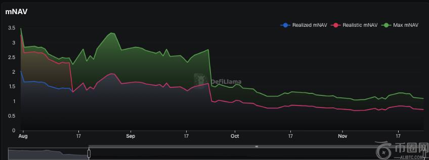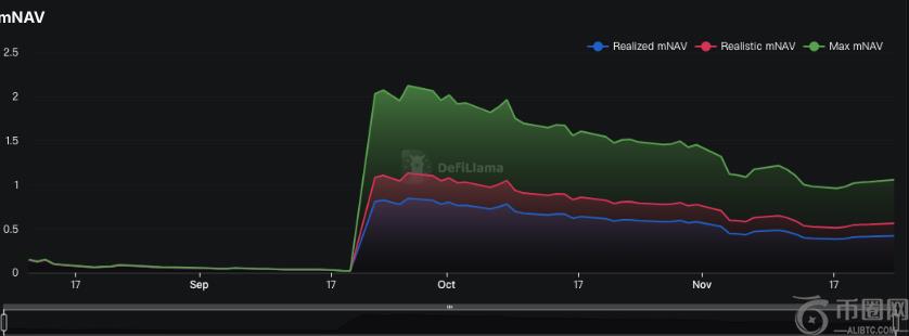 Nano Labs是一家实施BNB储备战略的上市公司。据DeFiLlama数据,其BNB持有量为128,000枚,不及CEA Industries储备量的四分之一,但Nano Labs的mNAV在8月至10月间维持在1.5以上。