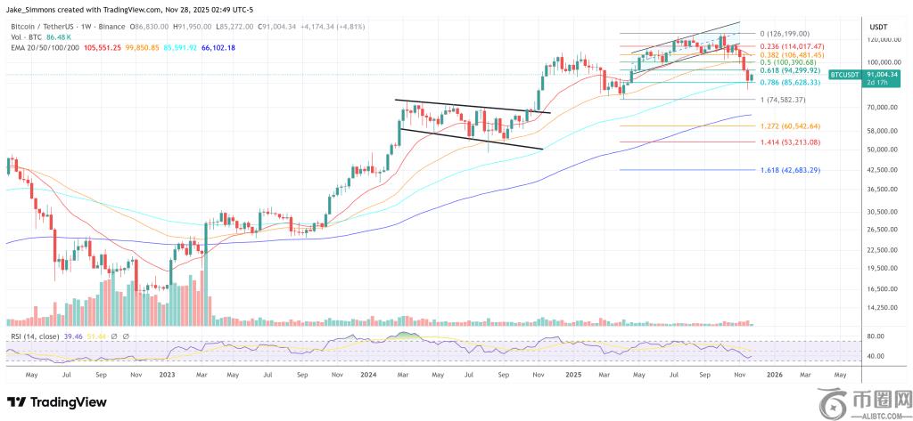 比特币价格维持在 0.786 斐波那契回调位和 100 周均线上方,1 周图表 |
