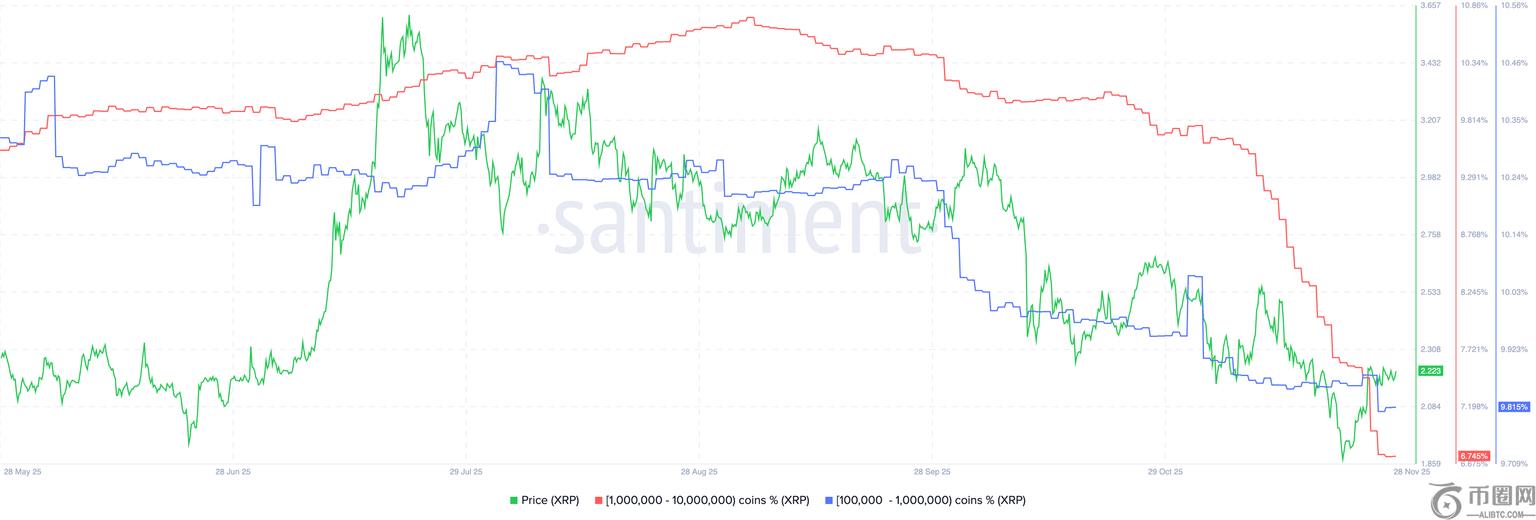 与此同时,大额投资者(也被称为“鲸鱼”)继续抛售 XRP,进一步加剧了抛售压力。下方的供应分布指标显示,持有 10 万至 100 万枚**的投资者群体(蓝线)目前占总供应量的 9.81%,低于 11 月 1 日的 10.06% 和 9 月 4 日的 10.21%。