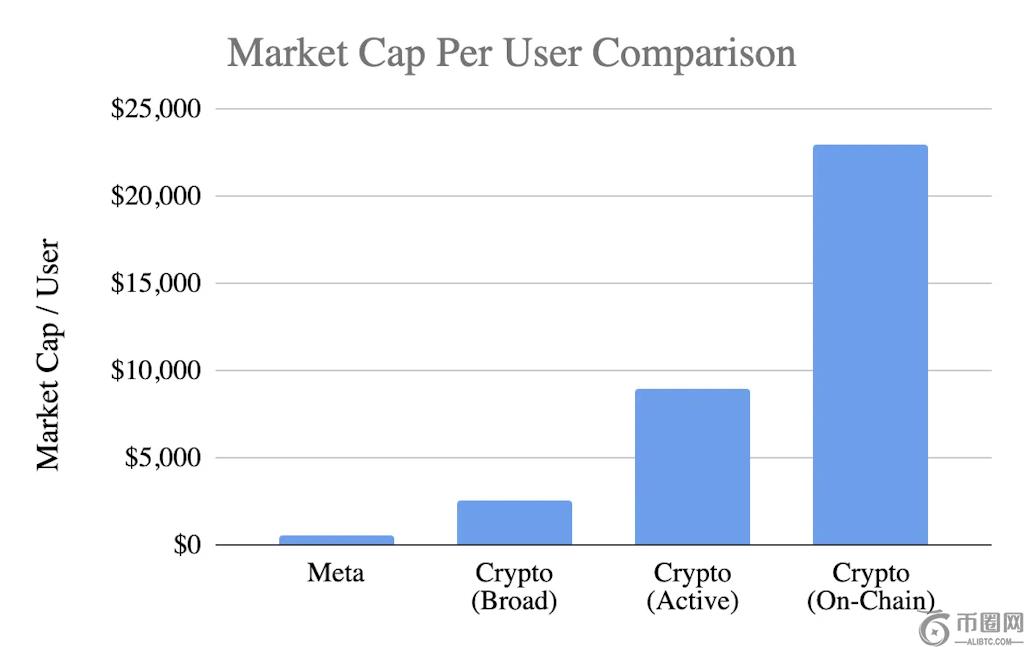 **亚哥认为,加密货币的交易模式已经展现出类似Facebook的网络效应,非比特币加密货币的市值约为1万亿美元。这意味着,尽管加密货币的货币化和用户留存率远低于Facebook,但其平均每个普通用户价值约为2500美元,每个活跃用户价值约为9000美元,每个链上月活跃用户价值约为23000美元。他指出,L1层级的加密货币市值约占90%,但其手续费份额已从约60%下降至12%,因为DeFi和其他应用程序仅从一小部分价值中攫取了大部分手续费。这种转变表明,真正的网络效应存在于可分叉的聚合层而非底层,而且尽管以太坊和Solana正在构建更强大的飞轮效应,但加密货币的定价已经反映了其尚未达到的互联网规模结算角色。