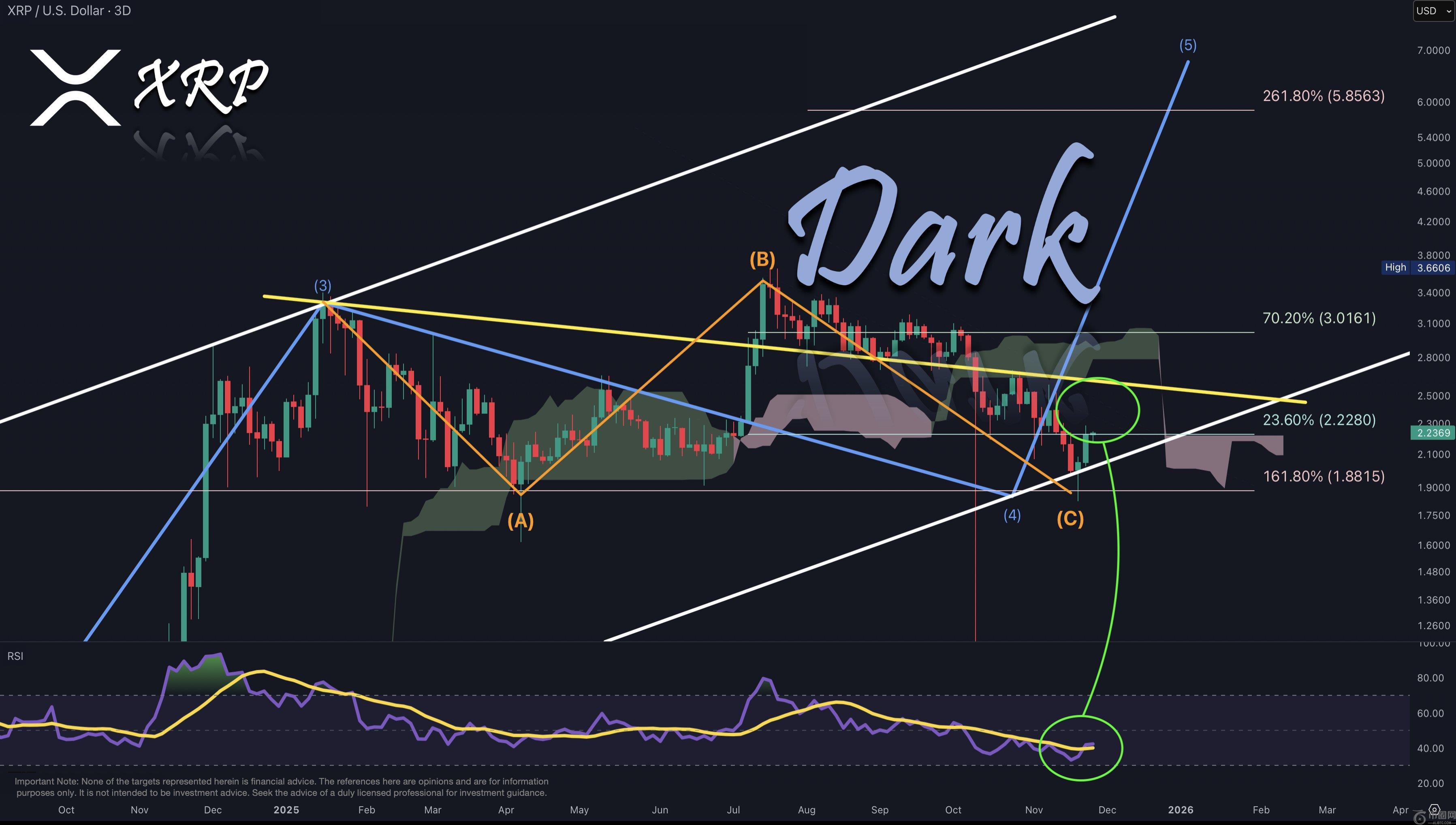 设置很简单。A-B-C 阶段的调整已经完成。**的 C 段触底反弹,正好落在深回撤位附近,强劲的反转往往出现在这里。触及该位置后,XRP 出现明显反弹。同一天,RSI 指标从年内低点回升,证实下跌阶段的力度已经减弱。