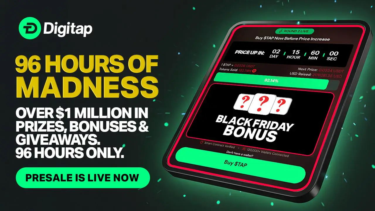 平台上的每一笔交易都会为 $TAP 带来价值。为了进一步推动增长,Digitap 正在举办“黑色星期五”活动。这场为期 96 小时的活动已经开始,团队将每小时推出新的赠品、折扣和奖励,奖池总额超过 100 万美元。这些优惠一旦结束,将**消失。