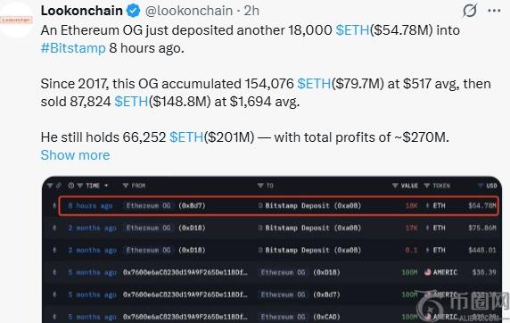 一个自 2017 年以来一直活跃的以太坊 OG 钱包于 11 月 29 日向 Bitstamp 转账了 18,000 个 ETH(价值 5478 万美元)。据 Lookonchain 报道这是本周以太坊巨鲸规模**的交易之一。