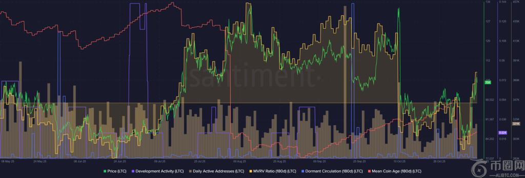 莱特币的链上行为表明,较老的**开始出现波动,而较新的、近期发行的**则保持相对稳定。过去24小时内: