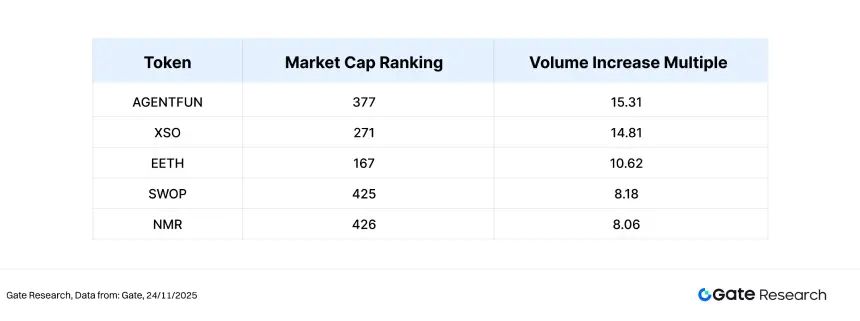 在价格表现之外,本文进一步统计了部分**的成交量变化,以观察市场活跃度与资金参与程度。以行情启动前的成交量为基准,计算其增长倍率并对比同期价格反弹幅度,评估市场关注度与短线资金动向。