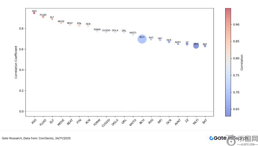 较低相关性区间(0.65–0.75) 则以 BCH、XVG、WFI、DCR、WLFI 为代表,气泡图中可见 BCH 与 WLFI 的市值规模显著较大。这类项目多属于基础设施型或具长期存储价值的资产,其价格波动受宏观影响较小,更多取决于自身生态进展或链上需求,例如 BCH 的支付叙事与长期存量需求,使其在大盘大幅波动时仍保持相对独立走势。