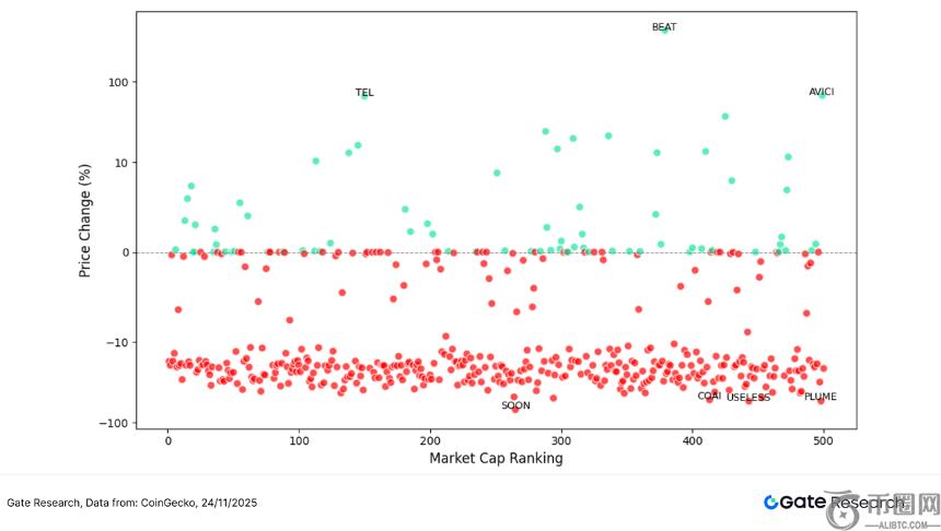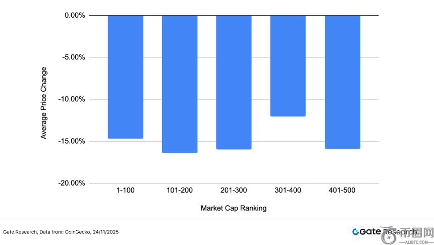 备注:市值分布以 CoinGecko 数据为基础,将市值排名前 500 的**按每 100 个进行分组(如排名 1–100、101–200 等),统计各组内**在 2025 年 11 月 11 日至 11 月 24 日期间的价格涨跌幅,并计算每组的平均值,作为该市值区间的平均涨幅指标。整体平均跌幅(14.99%)为市值前 500 名**个体涨幅的平均值,未加权。