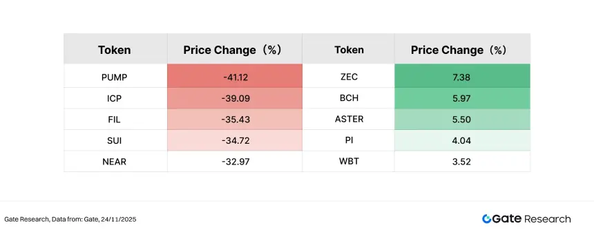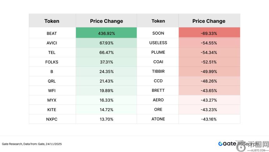 回顾 2025 年 11 月 11 日至 11 月 24 日期间,加密市场在 AI 泡沫疑虑、强劲就业数据与降息预期下修的压力下**回调,但 BTC 与 ETH 于 11 月 19 至 20 日出现低位技术性修复,行情整体呈震荡筑底结构。链上资金同步进入再分配阶段,Arbitrum 持续获得增量流入,Solana、Base 等生态回暖,而以太坊主网与 Hyperliquid 资金外流明显;股票与 ETF 的链上化规模逼近 1,000 万美元,推动 Arbitrum 加速向机构级结算枢纽靠拢。市值前 500 名**平均下跌约 15%,中大盘(市值 100–200)跌幅最深,而中小市值波动最为剧烈,BEAT 录得 436% 成为**弹性标的,AVICI、TEL 等题材币同步走强;SOON、USELESS、PLUME 等前期过热资产则回落 50–70%,体现“高 Beta 退潮、结构性分化”特征。