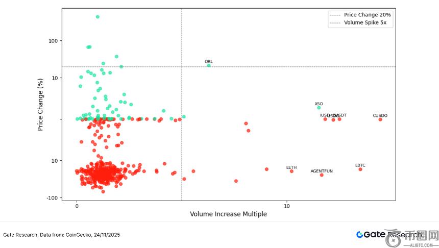 在延续成交量异动项目的观察基础上,本文进一步结合价格表现,绘制了成交量增长倍率(Volume Increase Multiple)与价格涨跌幅(Price Change %)的散点分布图。横轴代表**在过去两周成交量相较基准期的增长倍数,纵轴为同期价格变动百分比,并采用对称对数坐标轴,以清晰呈现“放量”与“涨跌”间的结构关系。