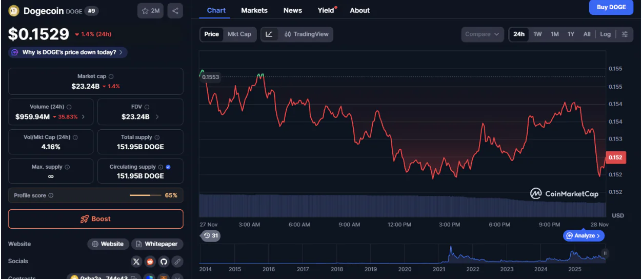 今日狗狗币价格位于0.1529美元随着交易量放缓,狗狗币(DOGE)再次走弱。市场数据显示,狗狗币下跌。下跌1.4%(24小时)标志着经过数周的稳定运动后,**个冷却期即将到来。