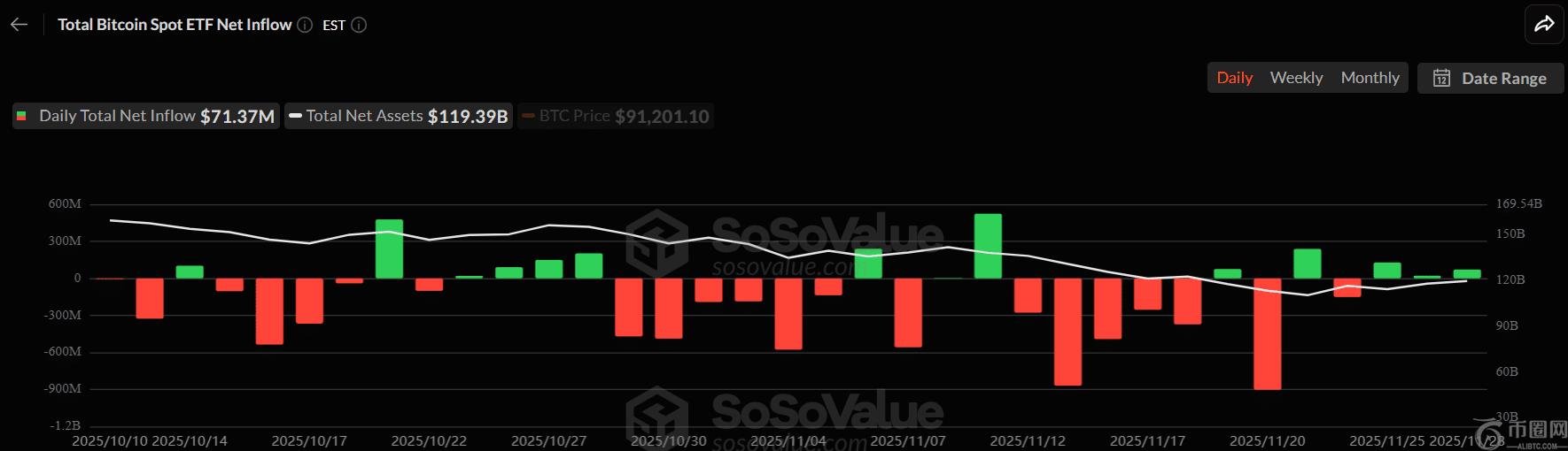 ETF数据显示,在价格下跌之前,需求明显降温。比特币现货ETF在经历了连续多日的巨额资金流出(**达-11亿美元)之后,仅录得7137万美元的净流入。