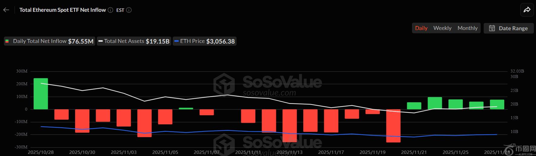 以太坊 ETF 也表现**,连续多日出现负资金流入,资产规模下滑至 191.5 亿美元。