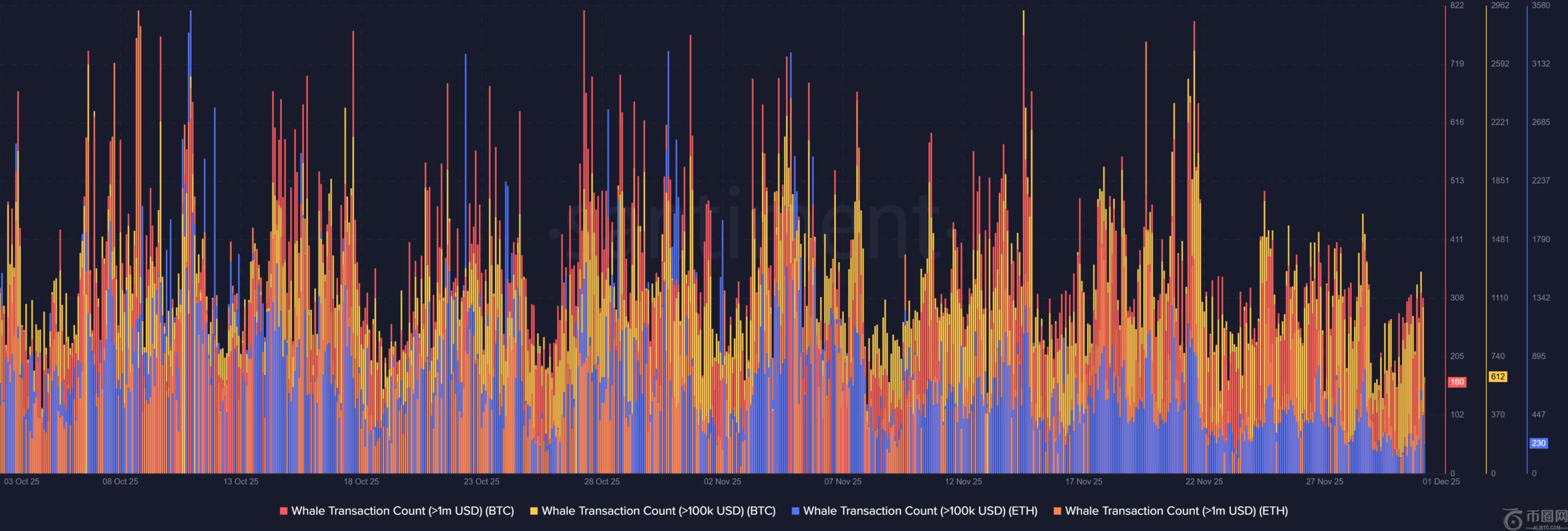 比特币和以太坊上的巨鲸交易活动均有所增加,**出现超过100万美元的交易峰值。大额持仓者积极转移资金,这通常会导致价格波动。