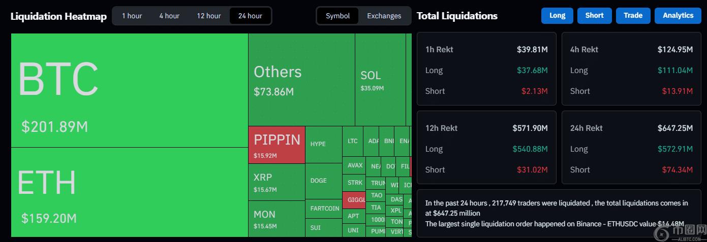 过去24小时内,交易员共计遭受6.4725亿美元的清算,其中多头损失**,达5.7291亿美元。仅比特币就清算了2.0189亿美元,以太坊紧随其后,清算金额为1.592亿美元。