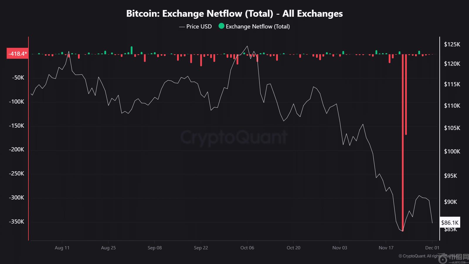 此外,比特币交易净流量图数据显示资金流入,其中包括一次接近-350K BTC的大幅飙升。这与86K美元附近的价格**相吻合。