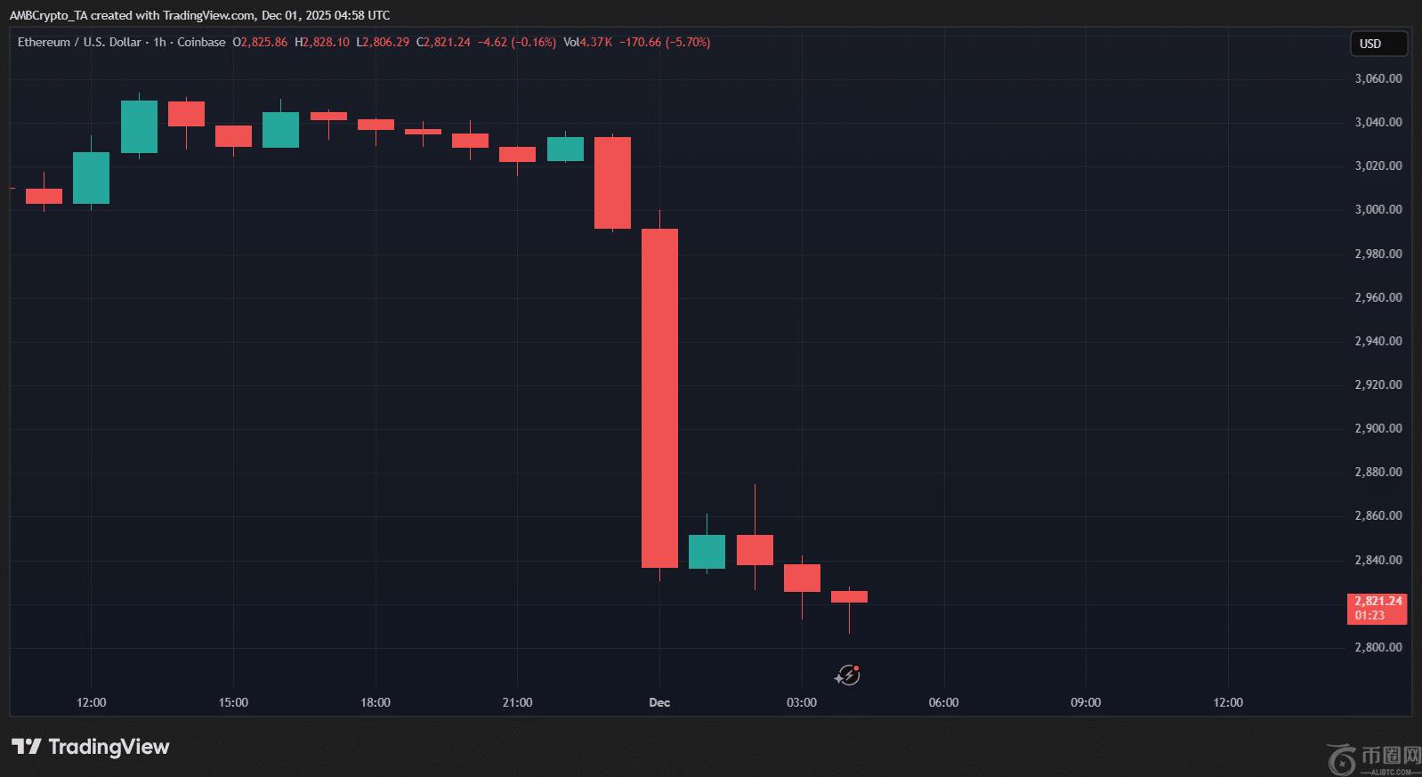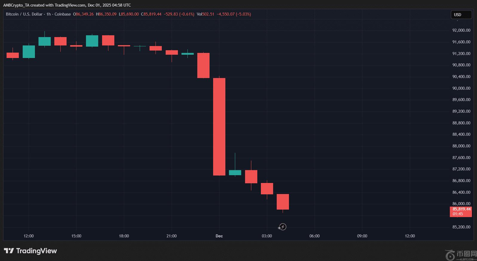 比特币和以太坊在12月开局均遭遇连续两小时的暴跌。比特币价格在一小时内从约86,300美元跌至近85,000美元,随后继续下跌至85,800美元附近。