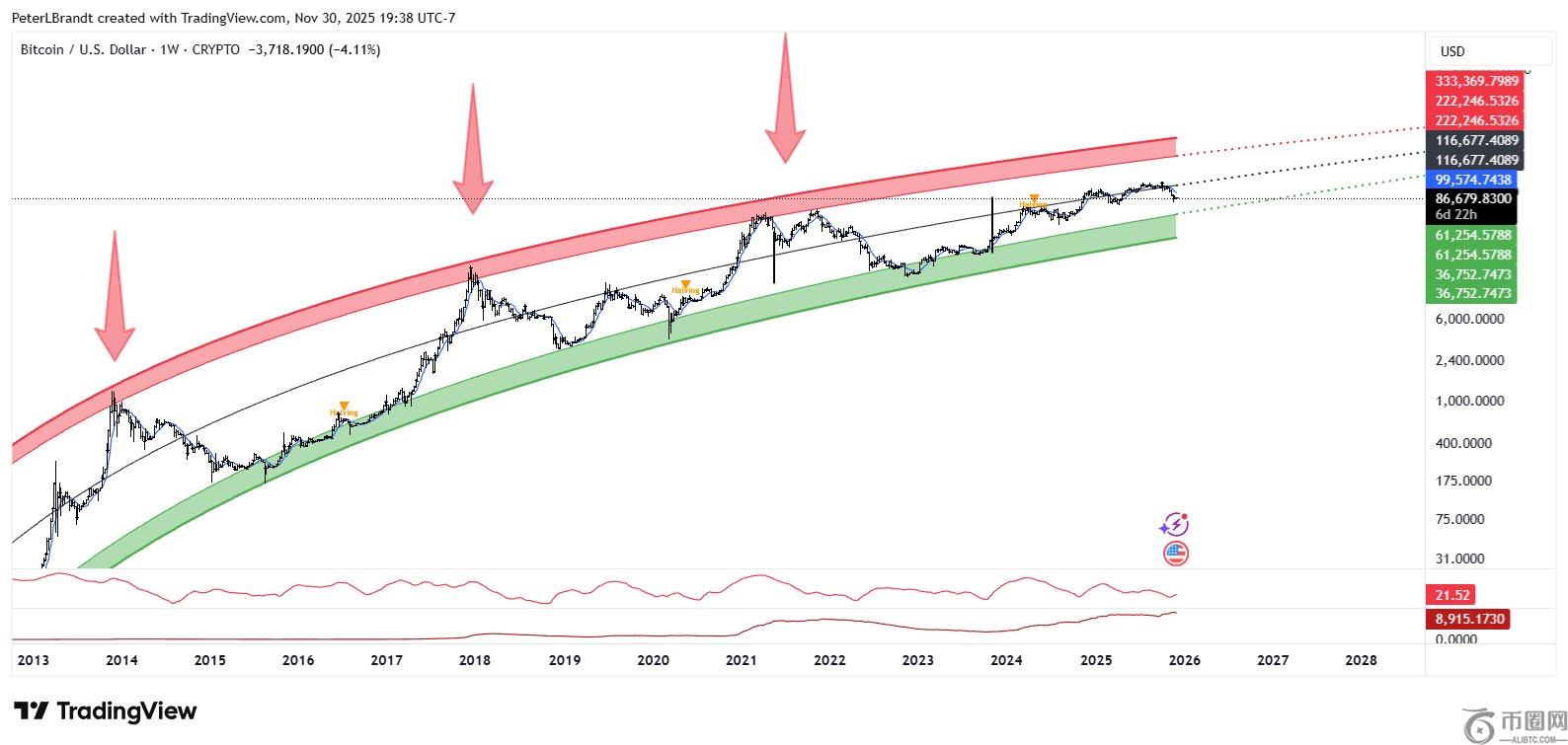 彼得·勃兰特一位拥有50年经验的知名交易员,在12月开盘时指出了一个几乎无人愿意看到的比特币目标价位,从而在比特币市场讨论中开辟了新的领域。在比特币价格于每枚86,000美元至93,000美元之间剧烈震荡之际,这位交易员在其**的X专栏文章中,直接切入了他长期关注的通道,并**强调了自2013年以来定义每一个主要周期的通道。