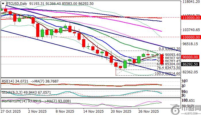 周一早盘交易中,BTC/USD 大幅下跌(到欧洲中期交易时段下跌约 6%),回落了 80514/93052 涨幅的 50% 以上,表明从 8 个月低点 (80514) 开始的调整阶段可能已经结束。