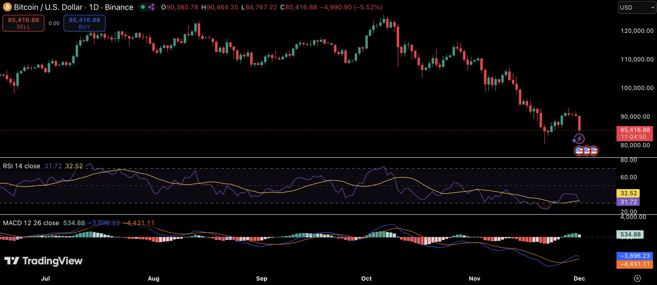 和 RSI目前徘徊在超卖区域附近,表明近期抛售势头强劲,而MACD移动平均收敛/发散