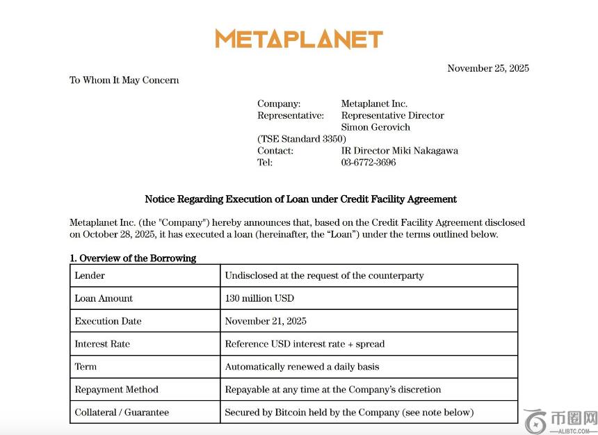 11 月 25 日,日本上市公司 Metaplanet 宣布根据信贷额度合同执行了一笔 1.3 亿美元的新借款,并以所持比特币作为担保。该信贷额度上限为 5 亿美元,截至目前累计借款已达 2.3 亿美元,资金将用于进一步购入比特币。简单来说,Metaplanet 的操作模式是通过抵押比特币获得现金,再用这笔现金买入更多比特币,从而形成“循环贷”。目前,公司账面仍持有 30,823 枚比特币,足以覆盖担保需求。筹集的资金计划用于追加购入比特币、推进比特币相关业务,甚至在市场允许时回购股票。Metaplanet 强调,本次借款对 2025 年度业绩影响轻微。