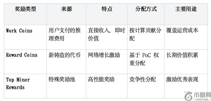 - 工作**,可以理解为即时收益,来自用户直接支付的 AI 任务费用,按算力贡献占比×质量评分分配,180 天线性释放(约每日释放 0.56%);