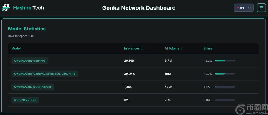 根据现有信息,Gonka 网络支持的 AI 模型主要为 Qwen/Qwen3 以及 Qwen/Qwen 2.5 等不同参数的 AI 应用,后续还将支持 Llama、Stable Diffusion 等 20 多项主流 AI 模型训练;每 1 枚 GNK **锚定 1 小时 H100 等效算力使用权。更多关于 Gonka 挖矿软件的运行部署信息详见此处。