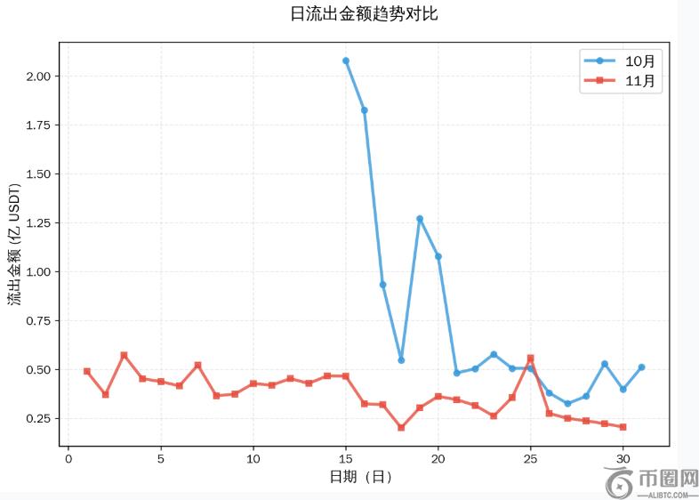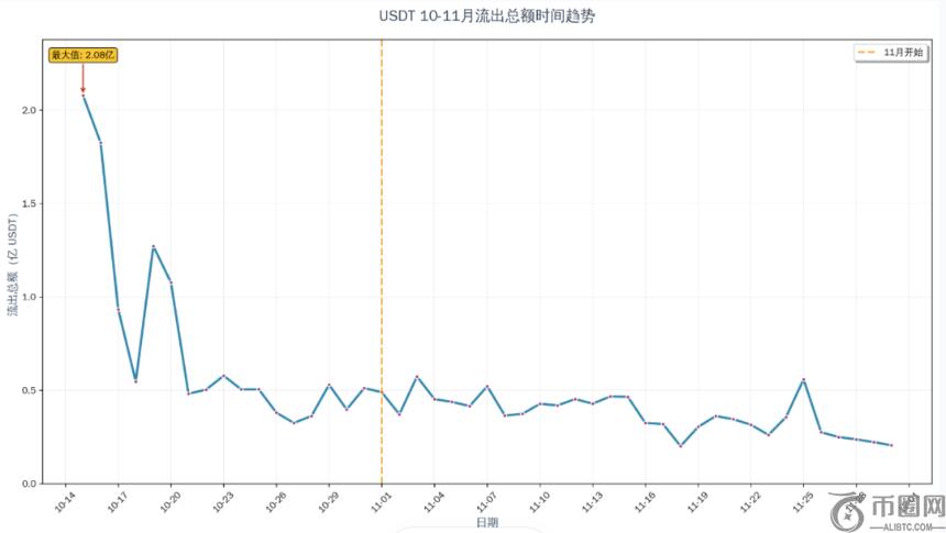 11月27日,汇旺支付开始限制提款额度,**于12月1日宣布暂停运营和提款。其USDT每日流出量的趋势如下图所示: