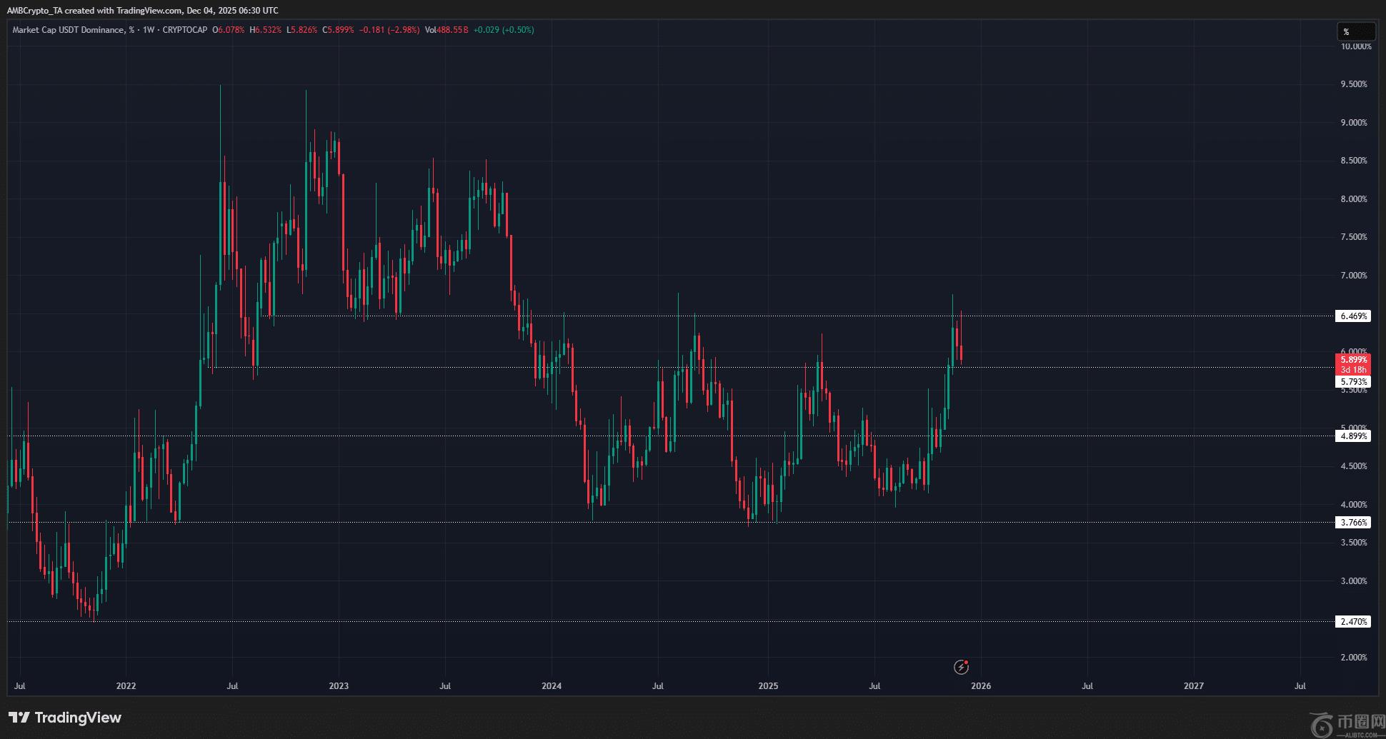 截至撰稿时,该价格在 6.47% 的阻力位遭遇阻力。自 2023 年 11 月以来,该阻力位一直有效。每次触及该阻力位后,Tether 的市场份额都会大幅下降。