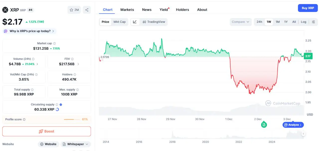 CoinMarketCap 数据数据显示,瑞波币价格小幅回升,目前已突破 2 美元大关。然而,瑞波币价格在 2.20 美元附近仍面临阻力。