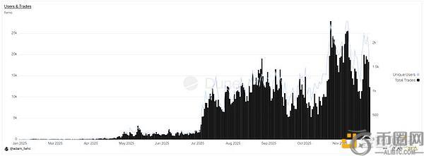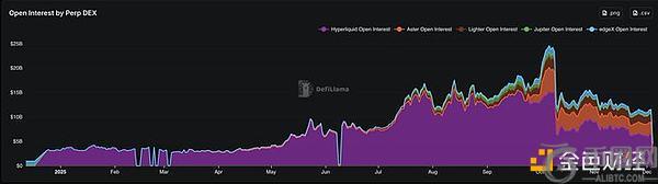 PerpDex 是今年的明星。DeFiLlama 数据显示,其持仓量(OI)平均增长了3-4倍,从30亿美元攀升至峰值的230亿美元。周交易量从800亿美元**至3000亿美元以上。