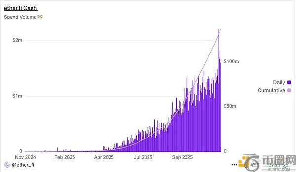 以 Etherfi 为例:日消费额已稳定增长至 100 万美元以上,且没有放缓的迹象。