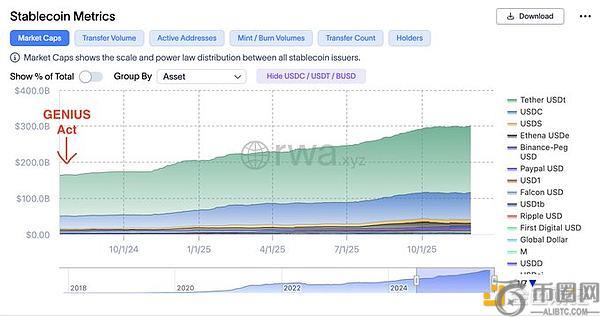 2025年7月,《天才法案》(Genius Act)签署,标志着**支付稳定币监管框架的出台。该框架要求稳定币必须拥有100%现金或短期国债的支持。