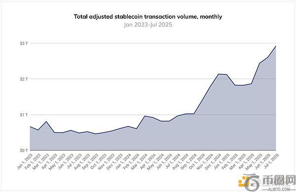 在过去一年中,稳定币月交易量已攀升至近 3 万亿美元,且采用正在迅速加速。虽然这可能不是一个**的衡量指标,但它已经显示出稳定币在《天才法案》和欧洲 MiCA 框架生效后的使用增长。