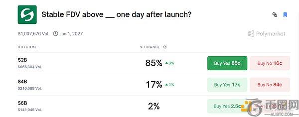 目前Polymarket数据显示,市场押注其上线首日后FDV超过20亿美元的概率为85%。按照保守估计20亿美元计算,STABLE币价对应为0.02美元。