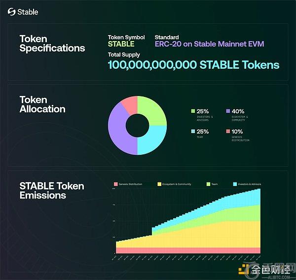 在主网上线之前,项目方发布了**及**经济学细节。其原生**STABLE总供应量为1000亿枚,总量固定不变。与大多数公链不同,Stable网络中的转账、支付和交易均以USDT结算,而STABLE**则主要用于协调开发者和生态系统参与者之间的激励机制。
