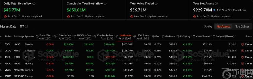 SOL相关的ETF产品于10月28日上市,尽管价格持续下跌约31%,但资金呈现逆势流入趋势。截至12月2日,整个SOL ETF板块累计净流入高达6.18亿美元,总资产达到9.15亿美元,占SOL总市值的1.15%。由Bitwise推出的BSOL表现尤为突出,吸引了约5.74亿美元的资金,成为SOL ETF中流入规模**的单只基金。其设计的质押收益机制为投资者提供了合规且便捷的参与方式。