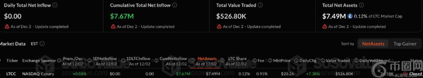 LTC ETF于10月29日上市后表现疲弱,价格下跌约7.4%,累计净流入仅747万美元,流动性不足,表明市场对其缺乏吸引力。