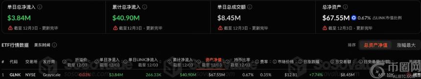 GLINK ETF于12月3日正式上线,首日流入近4090万美元,目前总资产价值约6755万美元,占LINK总市值的0.67%,开局良好。