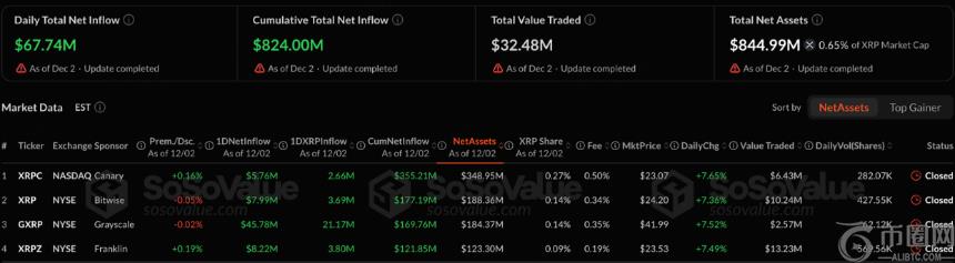 XRP ETF于11月13日陆续上线,同期价格下跌约9%,但仍呈现越跌越买的趋势。截至12月2日,累计净流入8.24亿美元,总资产价值约8.44亿美元,占XRP总市值的0.65%。多个发行商在市场份额上拉开差距,展现出竞争态势。
