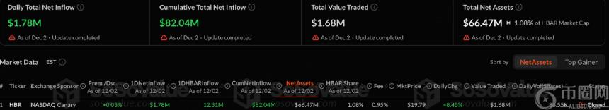 HBAR ETF作为中小市值项目的代表,取得了相对成功的渗透效果。自10月29日上线以来,尽管价格下跌约28%,但ETF累计获得8204万美元的净流入,资产管理规模占HBAR总市值的1.08%。