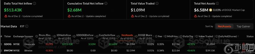 狗狗币ETF遭遇市场冷遇,灰度的GDOG(11月24日上市)表现惨淡,累计净流入仅268万美元,资产管理规模不足700万美元,仅占Doge总市值的0.03%。传统投资者对缺乏基本面支撑的Meme资产仍持怀疑态度。