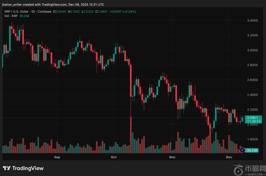 同时,XRP现货价格该**价格持续受到巨鲸交易活动的影响。近期抛售潮一度将该**价格推至 2 美元附近,随后趋于稳定,这反映了由大户推动的短期波动。相比之下,长期投资者似乎并未受到影响,他们继续持有仓位,这有助于稳定流通供应量。