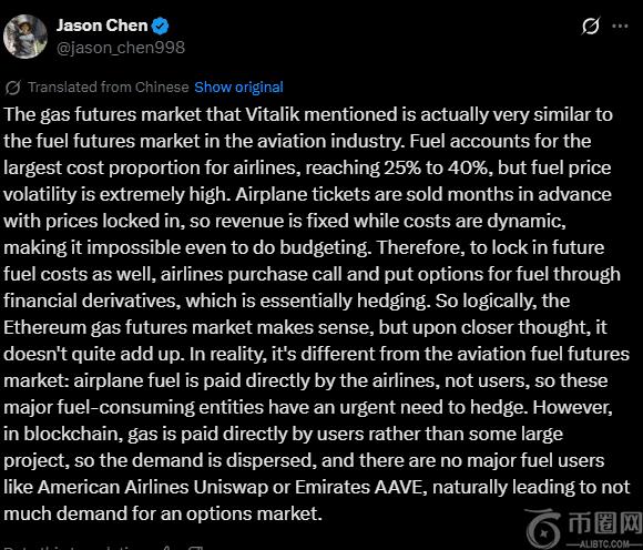 “在区块链中,gas 由用户直接支付,而不是由某些大型项目支付,因此需求分散,没有像‘美国航空 Uniswap’或‘阿联酋航空 **VE’这样的大型燃料用户,自然也就不会导致对期权市场有太大的需求。”