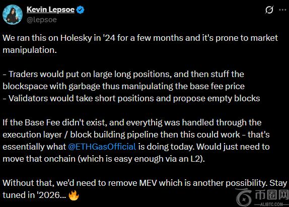Kevin Lepsoe,ETHGas(一个天然气期货市场)的创始人回声Buterin 呼吁这样做,但也警告说验证者可能会操纵基础费用。但他补充说,这种方法在第二层(L2)网络中或许可行。
