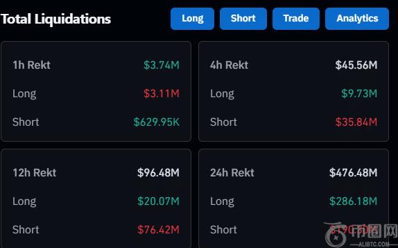 24 小时图表清晰地显示了这一点,近 5 亿美元已被清算。