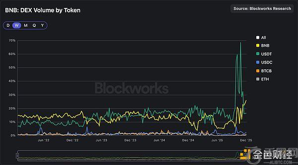 在2021-2022年期间,BNB作为交易媒介占据**主导地位,但随后USDT获得了市场份额并超越了BNB。