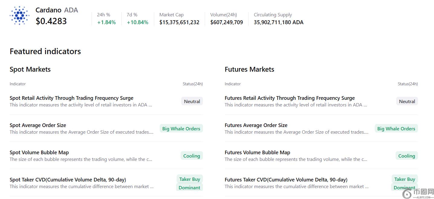 CryptoQuant 的汇总数据也支持看涨观点,Cardano 现货和期货市场均显示出巨鲸订单、市场降温以及买盘主导地位。这些因素预示着未来几天可能出现上涨行情。