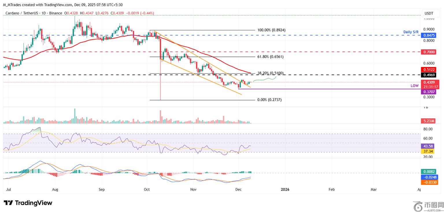 Cardano12月3日,价格突破了下降楔形形态(由两条趋势线连接多个高点和低点构成)。然而,上涨势头未能持续,随后回调并在上趋势线附近获得支撑。ADA周一上涨3.71%,截至周二发稿时,股价在0.43美元附近徘徊。