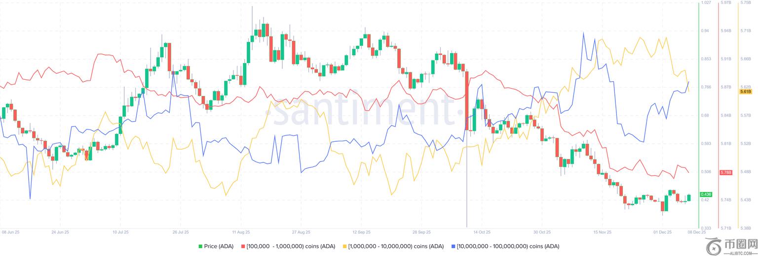 该指标显示,自 12 月 2 日以来,持有 1000 万至 1 亿 ADA **的巨鲸(蓝线)已积累了 1.6 亿枚**。同期,持有 100 万至 1000 万 ADA **的钱包(黄线)已减持了 9000 万枚**。