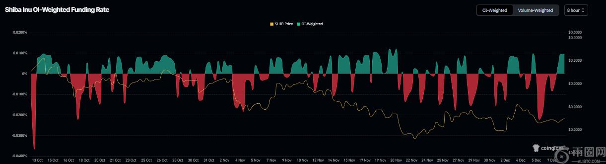 在衍生品方面,柴犬的融资利率数据也显示出复苏迹象。根据 Coinglass 的未平仓合约加权融资利率数据,押注柴犬股价将进一步下跌的交易员数量低于预期股价上涨的交易员数量。
